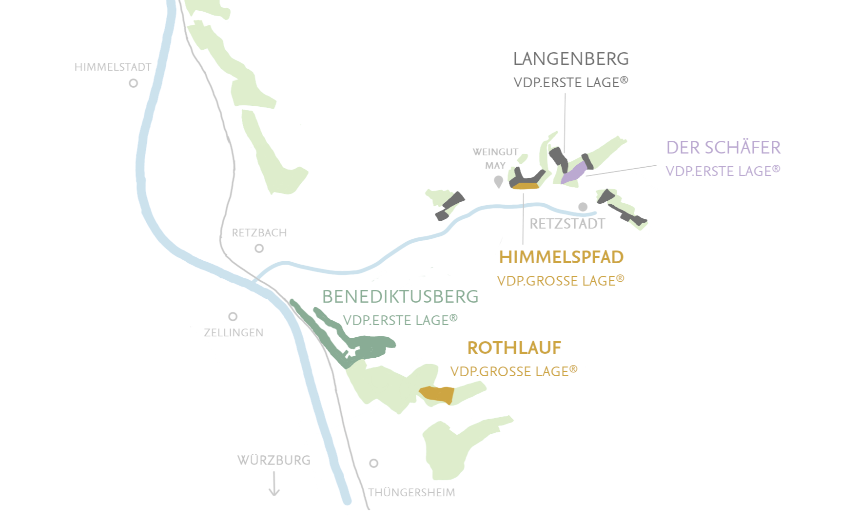 In einem der schönsten Seitentäler des Maines, nördlich von Würzburg, gelegen, befindet sich die VDP. ERSTE LAGE® Retzstadter Langenberg, unsere "Hauslage". Sie zeichnet sich aus durch ihren sehr kargen und schnell erwärmbaren Muschelkalkboden, der nach Südwest- bis Südsüdost ausgerichtet liegt. Man findet hier Steigungen von 25 bis 70%. Geschützt werden die Weinberge durch nördliche Waldbestände auf Bergkuppen. Schon seit über 1.200 Jahren wird hier Weinbau betrieben.
